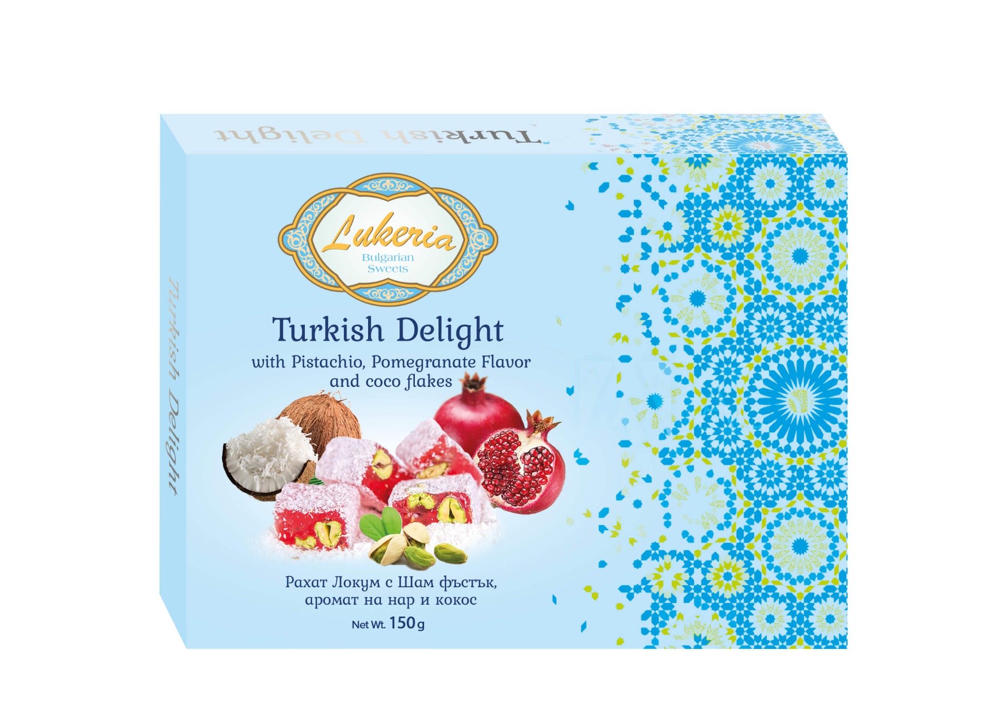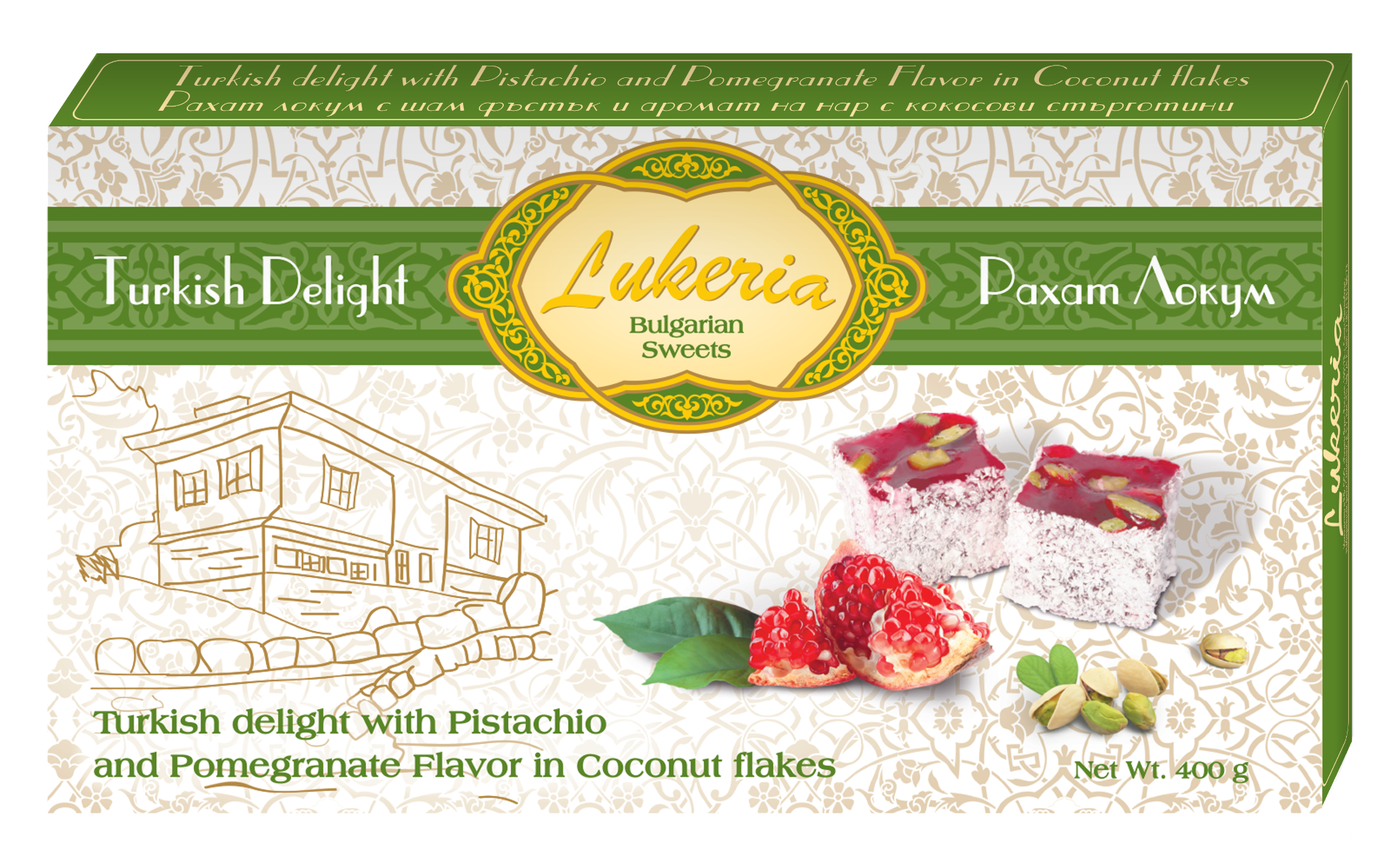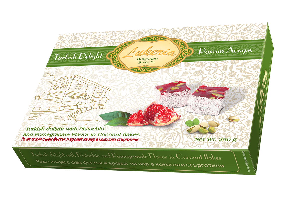 Рахат локум с шам фъстък и аромат на нар с кокосови стърготини 400гр
